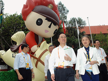 行政长官曾荫权与香港奥运村及残奥村村长梁爱诗巡视香港奥运村的设施。(图片来源:香港特区政府网站)