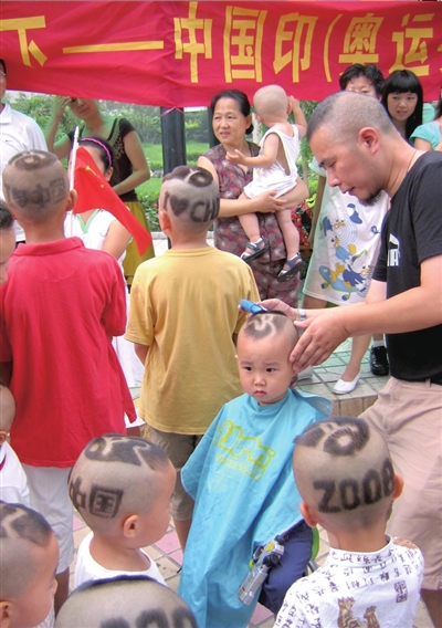 昨天,吴大胜(右一)正在一名小朋友头上“创作”。北京市民吴大胜这几天忙着免费为小区的孩子理“奥运头”,以迎接第29届奥运会。他在孩子们的头上理出多种图案,受到欢迎。