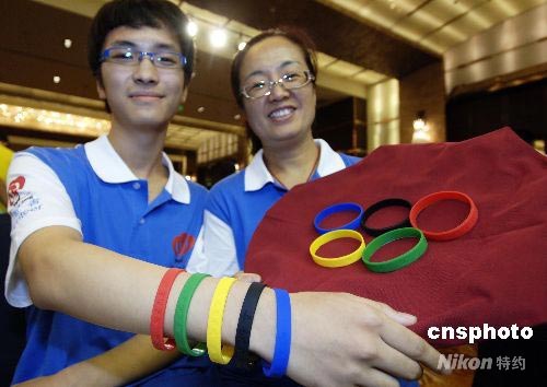 7月30日,北京奥运会志愿者恭杰克与其母亲共同展示“微笑圈”家庭版。当日,由奥运五环颜色组成的奥运“微笑圈”家庭版在北京正式发布,其内外侧统一印有北京奥运会、残奥会标志,主要面向志愿者家庭发放。中新社发 王东明 摄