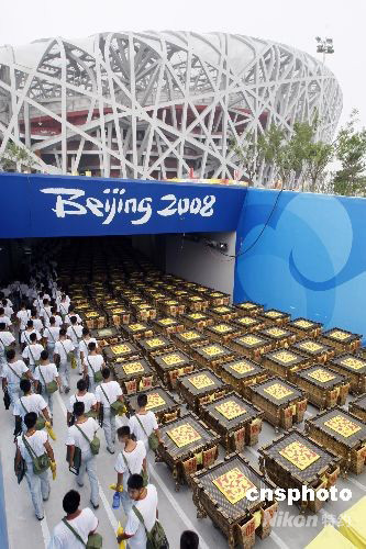 7月30日,第29届夏季奥运会开幕式在北京国家体育场“鸟巢”进行封闭式彩排,参演人员和道具陆续入场。 中新社发 杜洋 摄