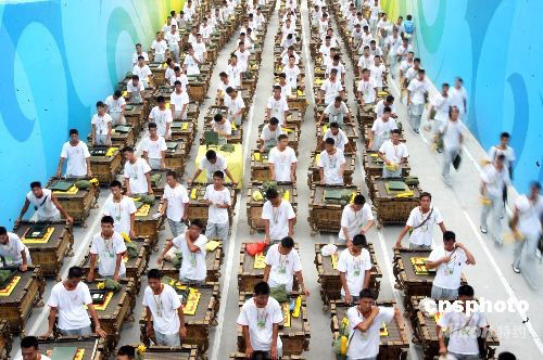 第29届夏季奥运会开幕式彩排在北京国家体育场“鸟巢”封闭进行,众多参演人员携带各种道具进入体育场。 中新社发 武仲林 摄