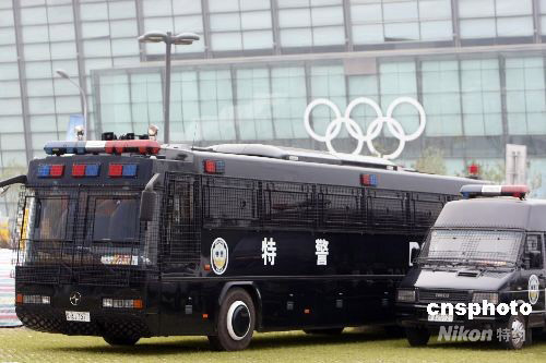 第29届夏季奥运会开幕式在北京国家体育场“鸟巢”进行封闭式彩排,场外特警防暴车严加警戒。 中新社发 杜洋 摄