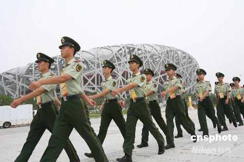 第29届夏季奥运会开幕式彩排在北京国家体育场“鸟巢”内封闭进行,武警、特警现场戒备,保安严密。 中新社发 武仲林 摄