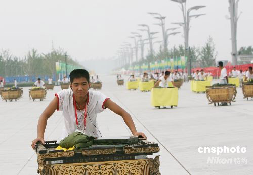 图为参演人员携带各种道具来到鸟巢。 中新社发 武仲林 摄