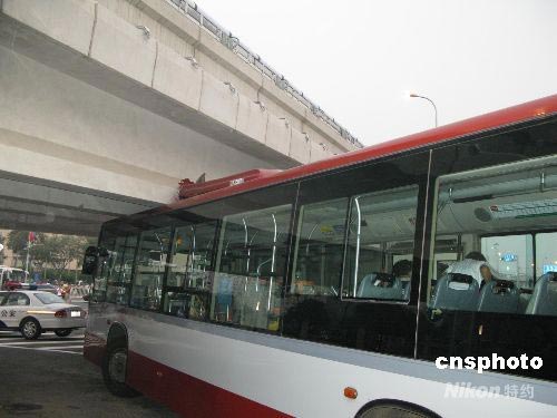 30日晚,记者目击了北京奥运开幕式彩排前发生的一桩交通意外。7点10分,一辆调度观众的公交车,在从鸟巢东门运送观众前往鸟巢其他入口时,车行至四环桥引桥下,因公交车司机误从小车拐弯道拐弯,车身过高,撞到鸟巢东门右侧的四环引桥上,现场发出巨大响声,五百米外清晰可闻,车顶撞坏。车身卡在桥下,幸车上只有四五名观众,无人受伤。图为卡在桥下的公交车。 中新社发 吴庆才 摄