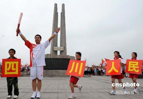 7月31日,奥运火炬在河北唐山传递。在唐山抗震纪念碑广场,火炬手、抗震志愿者宋志永在来自四川震区的儿童前展示奥运火炬。四川地震发生时宋志永自发前往地震灾区参与救援行动,徒手刨出5个遇难孩童的遗体。 中新社发 廖攀 摄