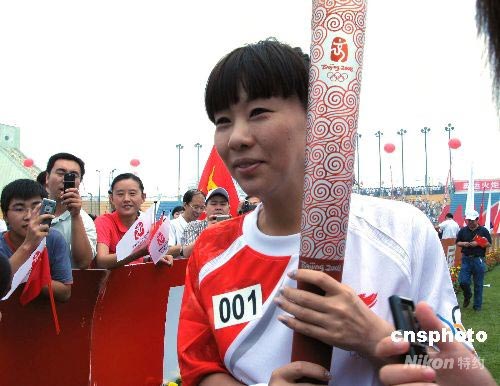 图:奥运冠军钱红唐山传递奥运火炬首棒