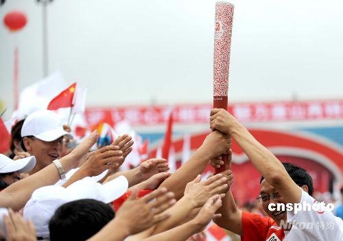 7月31日,奥运火炬在河北唐山传递,在传递过程中,唐山民众同火炬手热捧“祥云”火炬。中新社发 廖攀 摄