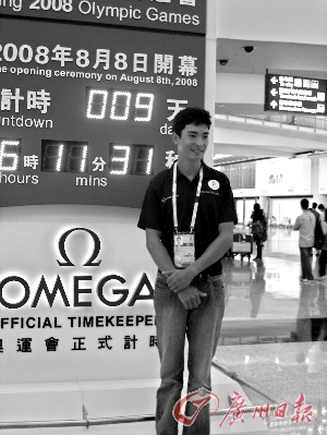 华天在香港的奥运倒计时牌下留影。特派记者 张顺亭 摄