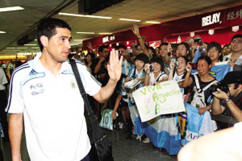 12时15分,阿根廷足球队稍事休息后,鱼贯步出候机大厅,早已等候在此的上海球迷立即欢呼起来,他们有的举着写有运动员名字的牌子,有的高喊运动员的名字。里克尔梅等球星,也热情地向球迷们挥手致意。