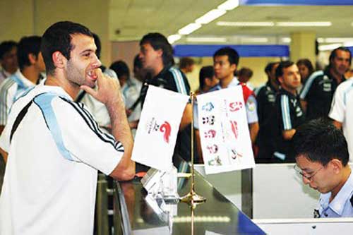 飞机比预定的时间晚到了几分钟,11时45分,阿根廷国奥队的运动员走出机舱,他们谈笑风生,显得非常轻松。通过检测体温区域后,马斯切拉诺第一个站到了边检验证台前。“您好!”边检民警用西班牙语向这位著名球员表示问候,并很快帮他办理了入境通关手续。