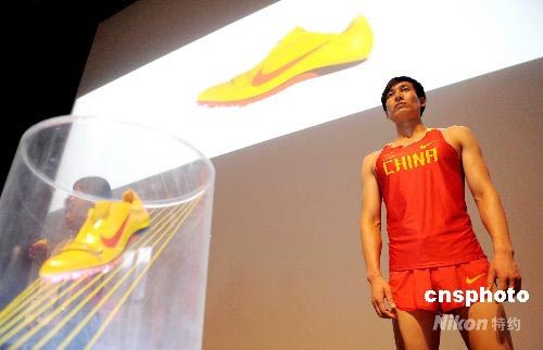 7月31日下午,刘翔的奥运战靴、战袍亮相京城。此次刘翔征战奥运所穿的这款战靴、战袍均含有当今世界最高科技成分,将有助于刘翔在“鸟巢”创造佳绩。 中新社发 陈文 摄