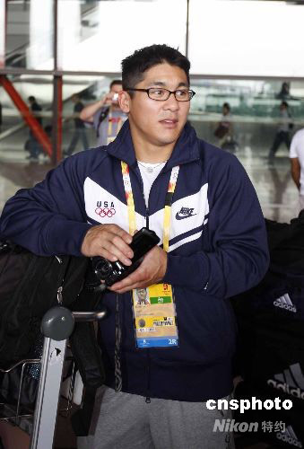 美国男子体操队飞抵北京,华裔体操选手谭凯文(Kevin Tan)在北京首都国际机场T3航站楼摆弄手中DV。这是他第一次来到北京,本次奥运会将作为美国男子体操队队长参赛。 中新社发 杜洋 摄