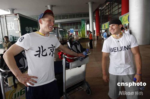 美国男子体操队抵达北京首都国际机场,他们身着印有“北京”字样的T恤衫格外显眼。中新社发 杜洋 摄