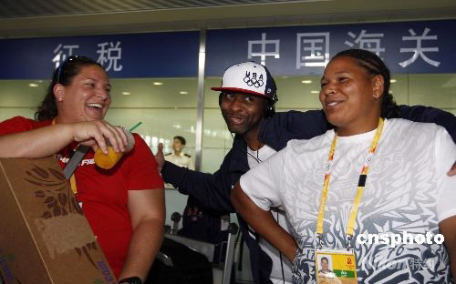 美国田径运动员Aretha thurmond(右)和Kristin heaston(左),在机场等待队友时开心聊天。 中新社发 杜洋 摄