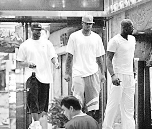 詹姆斯(左)安东尼(中)韦德(右)结伴从酒店外出。