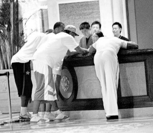 约两小时后,4人才离开浴室返回酒店。贵为天王巨星,4人看来比打一场球赛更加疲累,在询问处查询时,竟然不顾身份,旁若无人地趴在询问处柜台上休息。直至酒店职员安排好,4人才不情愿地站起身返回房间。据悉,极受球迷欢迎的安东尼离开浴室时,双手在自己身上做出不雅动作。