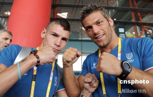 8月1日,即将参加北京奥运会的意大利拳击手飞抵北京首都国际机场。图为意大利拳击手valentino oomenico(左)与队友在一起。 中新社发 陈文 摄
