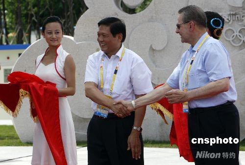 8月1日,北京奥运村“和平友谊墙”正式启动。图为国际奥委会主席罗格与北京奥组委主席刘淇,共同为“和平友谊墙”剪彩。 中新社发 杜洋 摄