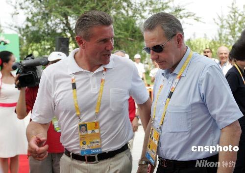 国际奥委会主席罗格与国际奥委会运动员委员会主席、前世界著名撑竿跳高运动员谢尔盖·布勃卡(左)在一起交谈。 中新社发 杜洋 摄