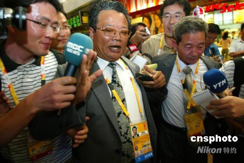 8月2日,朝鲜奥委会主席朴学先(中)率朝鲜奥运代表团飞抵北京首都国际机场。