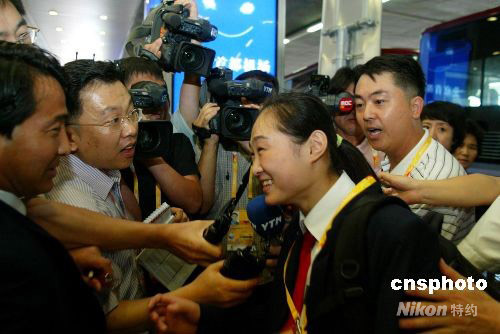 曾摘得2007年德国斯图加特体操世锦赛女子跳马银牌的朝鲜体操名将洪淑贞(中),随朝鲜奥运代表团一起抵达北京备战奥运会。