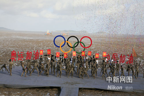 近日,来自全国各地的摄影家、摄影爱好者200余人,齐聚浙江舟山岱山县秀山岛滑泥主题公园,以“加油奥运、点燃激情、与泥共舞”为主题开展摄影大赛。图为泥人摆开龙门阵为2008北京奥运加油。作 者:任齐俊 夏毅