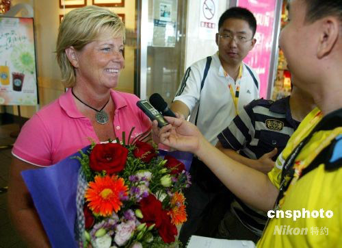 8月2日,前中国女足主教练多曼斯基(左)现身首都国际机场。她这次是作为瑞典足协官员来中国考察足球比赛场地。 中新社发 富田 摄