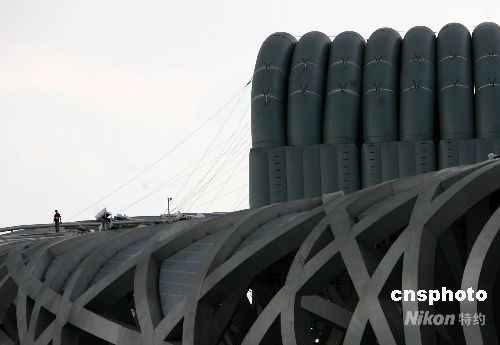 8月2日,北京奥运会开幕式第二次彩排在国家体育场“鸟巢”进行。图为工作人员在“鸟巢”顶部布置。 中新社发 武仲林 摄