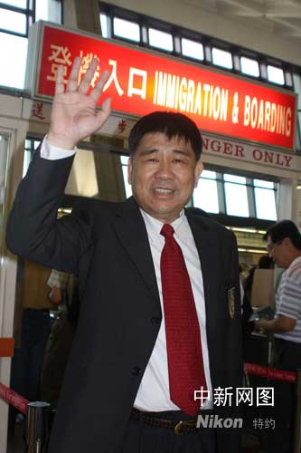 图为蔡赐爵在桃园机场登机入口处挥手致意。(中新网记者 董会峰/摄)