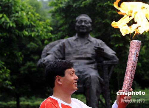 8月3日,奥运圣火在四川广安传递,牌坊村村民李良国在邓小平铜像前传递奥运火炬。