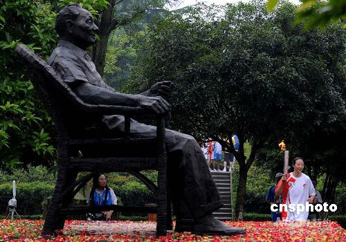 图:女排选手陈静在邓小平铜像前传递奥运火炬