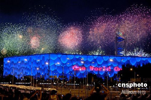 8月2日晚,北京奥运开幕式带妆彩排在“鸟巢”举行,图为“水立方”上空试放焰火。 中新社发 王东明 摄