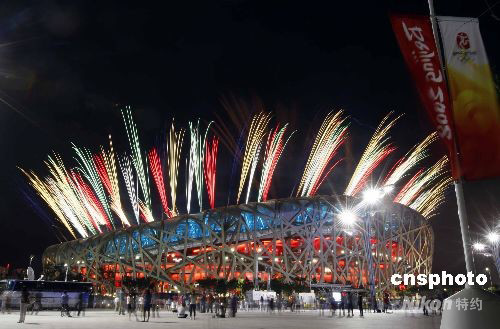 8月2日,北京奥运会开幕式彩排,“鸟巢”放焰火。 中新社发 杜洋 摄