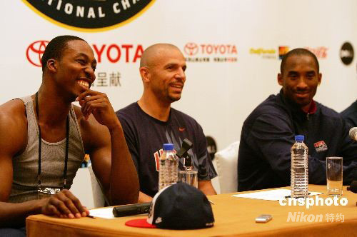 8月2日,巨星云集的美国国家男篮抵达上海,备战即将进行的北京奥运会。他们将在沪与俄罗斯、澳大利亚男篮进行两场比赛,为奥运热身。当日,美国男篮主教练与部分球员出席媒体见面会,回答中外媒体提问。图为左起德怀特·霍华德 (Dwight Howard)、贾森·基德 (Jason Kidd)、科比·布莱恩特 (Kobe Bryant)在轻松回答记者提问。中新社发 汤彦俊 摄