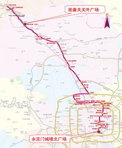 此次演练将由永定门城楼北广场起点出发,经永定门北广场、天桥南大街、天坛路、祈年大街、前门东大街、天安门广场西侧路、东长安街、南北河沿大街、平安大街、雍和宫大街、和平里西街、樱花园西街、惠新西街、安苑路、安定路、北四环路北侧主路、学院桥、北四环路北侧辅路、保福寺桥、北四环路北侧主路、海淀桥、颐和园路、芙蓉北路、万泉河路、北五环路南侧主路、八达岭高速公路、小营出口、八达岭高速公路东侧辅路、昌平西关环岛、八达岭高速公路北侧辅路、陈庄桥、南口东大街路口、八达岭老路至岔道城口,沿八达岭高速公路出京方向主路逆行至居庸关长城结束。