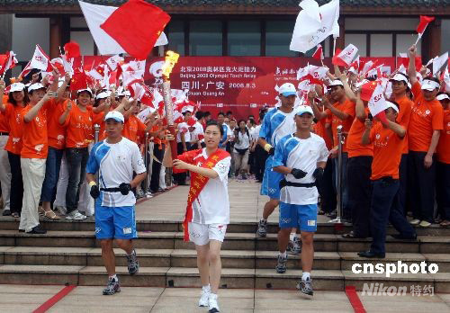 8月3日,奥运圣火开始在四川传递,抗震英模蒋敏跑出广安传递首棒火炬。彭州市公安局光明路派出所教导员蒋敏在“5·12”汶川大地震中,痛失10位亲人仍然顽强奋战在抗震救灾的第一线、感动了亿万中国人、被授予一级英模、被网友称为“中国最美女警”、被公安部长称赞是“全国最坚强的女警花”。 中新社发 廖攀 摄