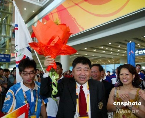 8月3日下午,中华台北奥运代表团一行50人,经香港转机抵达北京,征战2008年北京奥运会。图为代表团抵达北京后,中华台北奥运代表团主席蔡赐爵受到热烈欢迎。