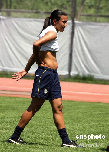 8月3日,巴西女足灵魂人物、“世界足球小姐”玛塔长衣短打扮。当日,巴西女足队员于炎热的中午在沈阳奥体中心训练场进行训练。中新社发 张宇 摄