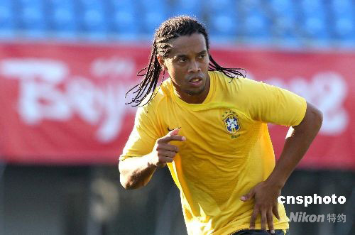 8月3日下午,巴西男足主力队员罗纳尔迪尼奥沈阳进行赛前训练。中新社发 张宇 摄