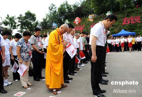 8月4日,奥运火炬在四川乐山传递,在传递起跑现场与会者为四川地震遇难者默哀。 中新社发 廖攀 摄