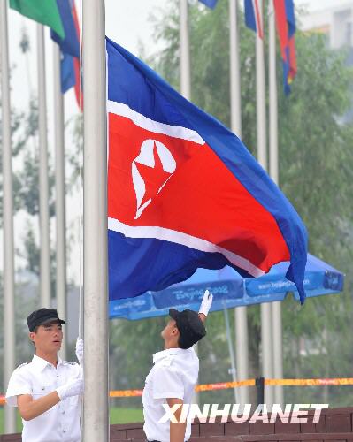 8月4日,朝鲜国旗在北京奥运村升起。当日,朝鲜奥运代表团在北京奥运村举行升旗仪式。 新华社记者张国俊摄