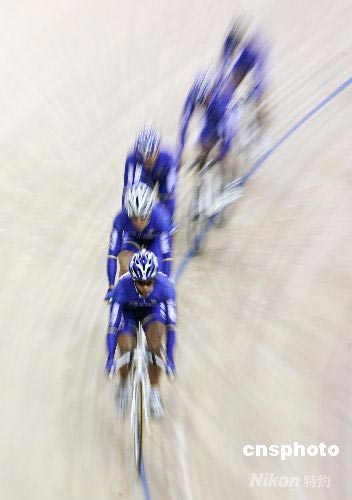 8月4日,哥伦比亚队队员在北京老山自行车馆进行训练,备战即将开幕的北京奥运会。 中新社发 武仲林 摄