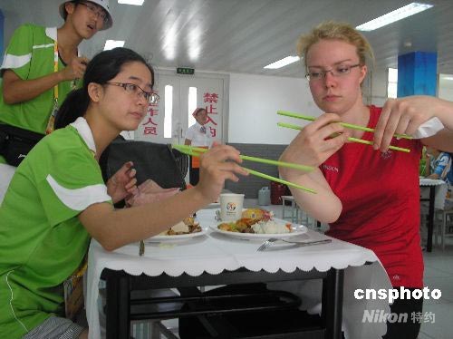 8月4日,奥林匹克青年国际营员正式报到注册。图为中国营员正在教国际营员使用筷子。中新社发 赖松 摄