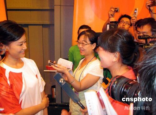 八月四日,奥运火炬北京段传递路线和部分火炬手名单公布。中国知名歌唱家宋祖英在首场新闻发布会上亮相,宣布将担任火炬手。宋祖英将出现在八月七日北京地坛火炬传递活动现场。在此之前的火炬传递活动中,较少出现火炬手提前曝光、与媒体会面的情形。中新社发 许晓青 摄