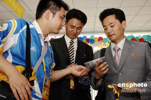 8月5日,首次参加奥林匹克青年营的朝鲜营员崔正哲(右)和CHUNG HYOK RI(中)抵达北京奥林匹克青年营营地,志愿者正在为其办理入营手续。 中新社发 王东明 摄