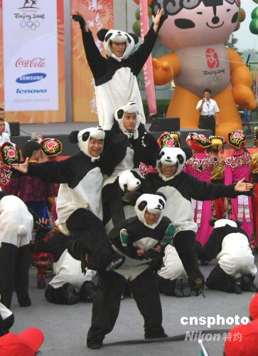 8月5日上午,奥运火炬在成都传递,多才多艺的成都人在火炬传递起点“成都出口加工园”举行了精彩的文艺表演。图为装扮成大熊猫的杂技演员在表演。中新社发 黄永莉 摄