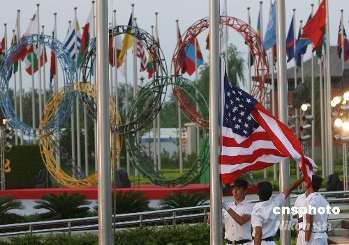 8月5日晚,参加北京奥运会的美国代表团在北京奥运村举行升旗仪式,奥运村村长陈至立等出席。中新社发 武仲林 摄