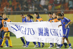 2007年9月世界杯对阵德国的比赛结束后,日本女足队员在中国赛场内高举“谢谢”横幅。