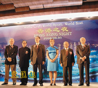 中新网8月6日电 据香港文汇报报道,香港赛马会5日在其北京会所举办北京2008“香港之夜”迎奥运活动。前国际奥委会主席萨马兰奇、国际奥委会委员维尔布鲁根、香港政务司司长唐英年、马会主席陈祖泽、奥委会会长霍震霆、国际马术运动联合会主席哈雅公主等为活动主礼。